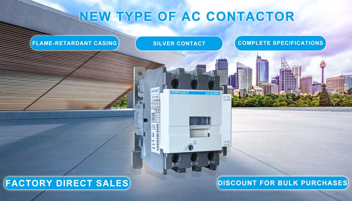 SONTUOEC on üks Hiina tarnijatest/tootjatest, kes on spetsialiseerunud erinevate väikeste elektriseadmete tootmisele ST1N-seeria vahelduvvoolukontaktor sobib vooluringides kasutamiseks kuni 660V AC 50Hz või 60Hz, nimivool kuni 95A, vahelduvvoolumootori valmistamiseks ja katkestamiseks, sageli käivitamiseks ja juhtimiseks. Koos abikontaktiploki, taimeri viivituse ja masina blokeerimisseadmega jne saab sellest viivituskontaktor, mehaaniline blokeeriv kontaktor, täht-kolmnurkstarter. Termorelee abil ühendatakse see elektromagnetilise starteriga. Kontaktor on toodetud vastavalt standardile IEC 60947-1.