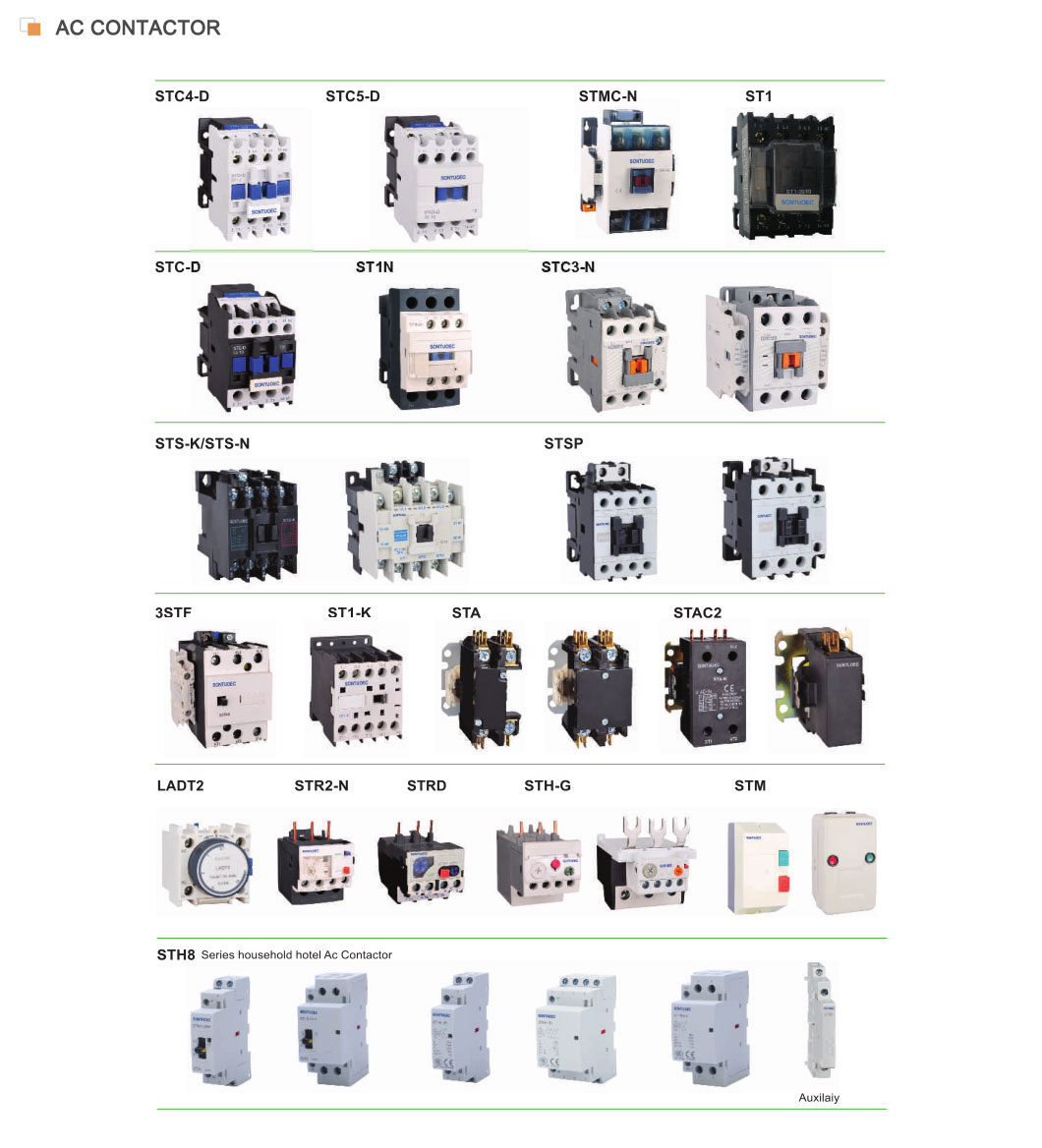 Sontuoec on üks Hiina tarnijaid/tootjaid, kes on spetsialiseerunud mitmesuguste väikeste elektriseadmete tootmisele STS-N95 seeria vahelduvvoolu kontaktor 220V, 380V 3PSONON sobib vooluahelates kasutamiseks nimiväärtuses kuni 660 V AC 50Hz või 60Hz, nimivoolu kuni 95A-ni kuni purunemiseks, mis on DEPENTY MOTORY & DEPENTRE MOTORY. Kombineerituna abiploki, taimeri viivituse ja masinaga seotud seadme jnega, saab sellest viivituse kontaktor, mehaaniline blokeeritav kontaktor, Star-Delta starter. Termilise releega ühendatakse see elektromagnetiliseks starteriks. Kontaktor toodetakse vastavalt IEC 60947-4-1.